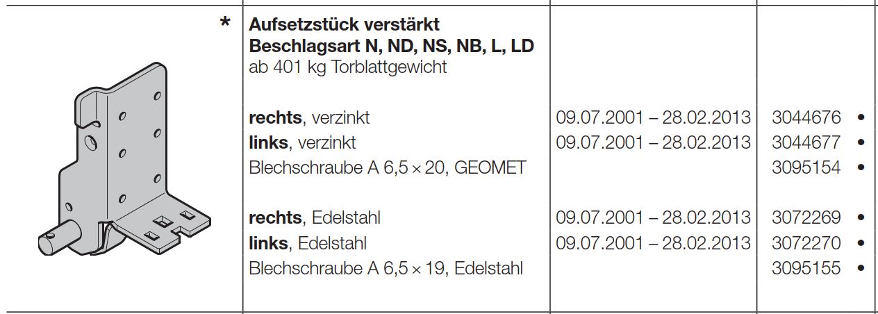 Hörmann Aufsetzstück Beschlagsart H, HD, HS, HU, HB, V, VU, VS, NH der Baureihe 30, 40, 50, Links