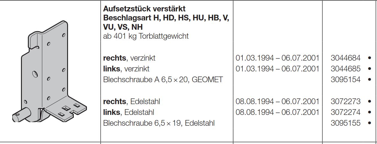 Hörmann Aufsetzstück rechts verstärkt Beschlagsart H, HD, HS, HU, HB, V, VU, VS, NH der Baureihe 30, 40, 50 Edelstahl