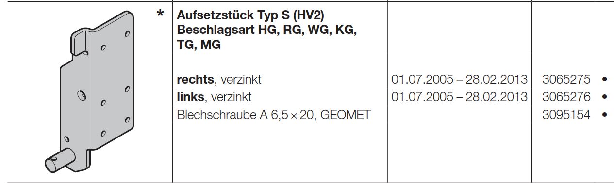 Hörmann Aufsetzstück Typ S (HV2) Beschlagsart rechts für Baureihe 30-40