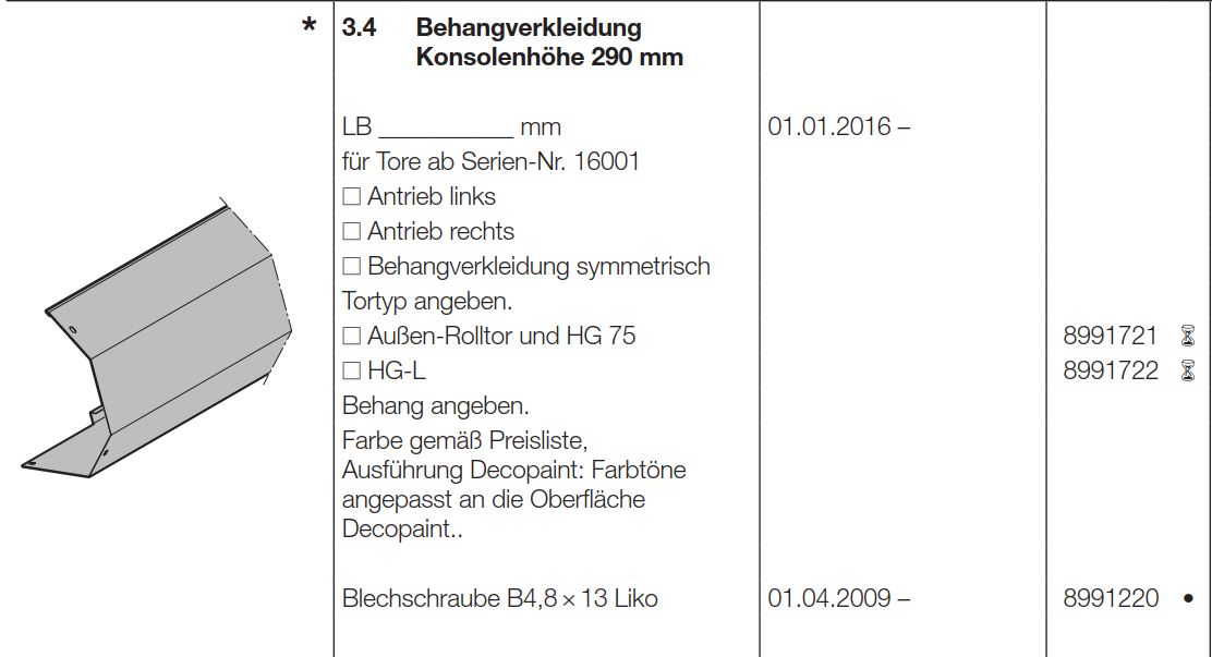 Hörmann Behangverkleidung Konsolenhöhe 290 mm Außen-Rolltor und HG-L