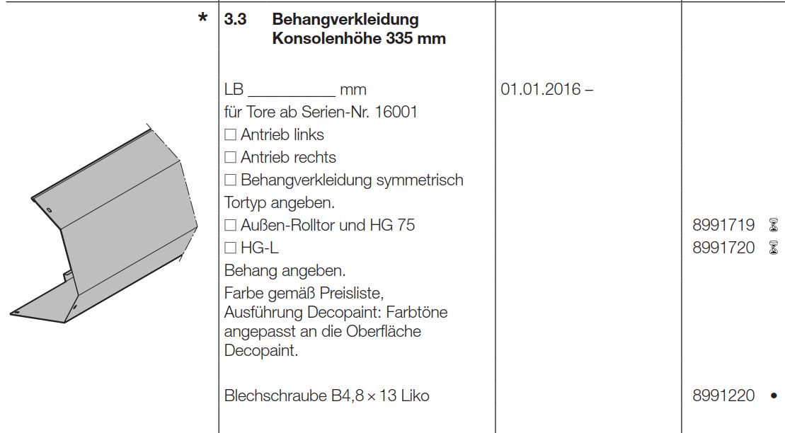 Hörmann Behangverkleidung Konsolenhöhe 335 mm Außen-Rolltor und HG -L