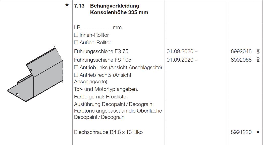 Hörmann Behangverkleidung Konsolenhöhe 335 mm FS 75 Garagen-Rolltor RollMatic T