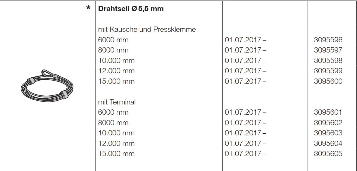 Hörmann Drahtseil Durchmesser 5,5 mm mit Kausche und Pressklemme 6000 mm für die Baureihe 50