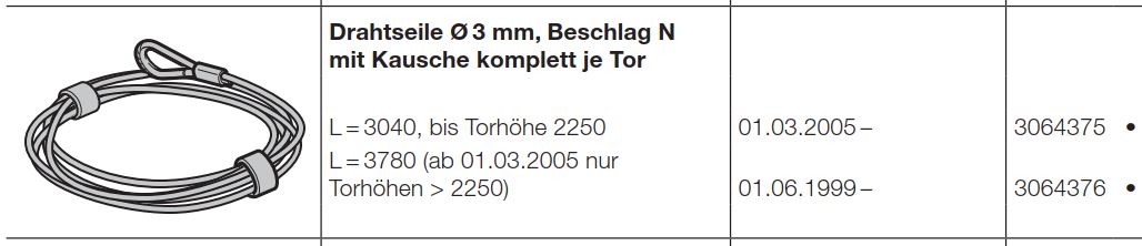 Hörmann Drahtseile Ø 3 mm, Beschlagsart N, mit Kausche, komplett je Tor, L = 3780 mm