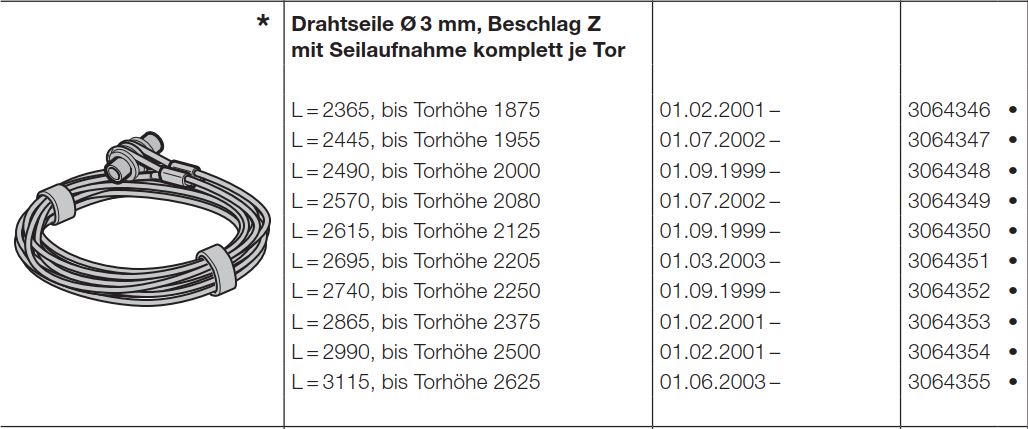 Hörmann Drahtseile Ø 3 mm, Beschlagsart Z mit Seilaufnahme, komplett je Tor, Torhöhe 1875 mm