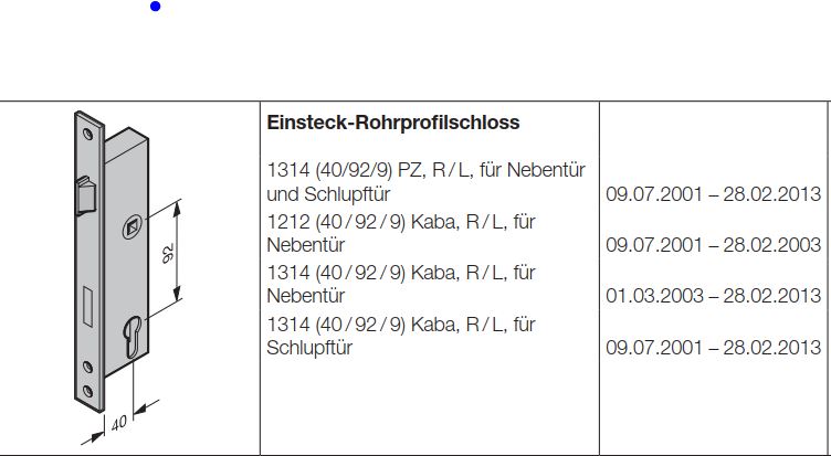 Hörmann Einsteck-Rohrprofilschloss 1314 für Neben-und Schlupftür (40-92-9) Baureihe 30-40-50-60
