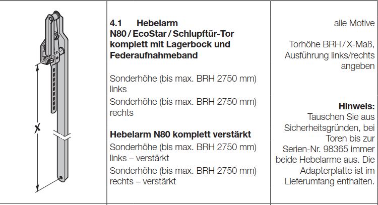 Hörmann Hebelarm, für N80 komplett für die Torhöhe 1920 mm von innen gesehen links