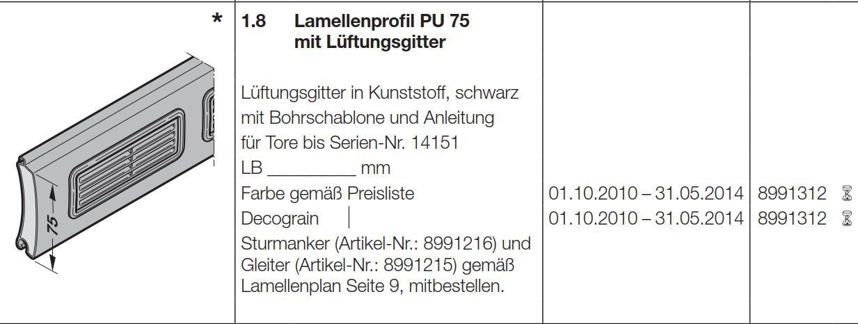 Hörmann Lamellenprofil PU 75 mit Lüftungsgitter Farbe gemäß Preisliste