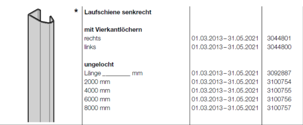 Hörmann Laufschiene senkrecht ungelocht, Länge 2000 mm, für Industrietore-Baureihe 30,40,50