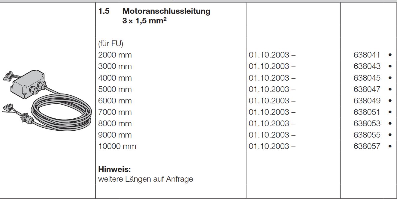 Hörmann Motoranschlussleitung 3 × 1-5 mm² Industrieantriebe WA 400, ITO 400