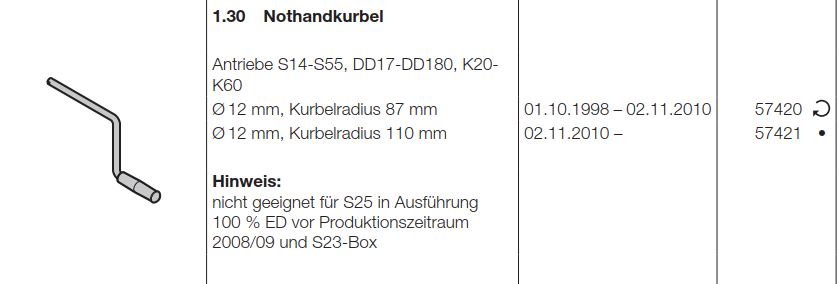 Hörmann Nothandkurbel Steckantriebe 12 mm Kurbelradius 110 mm