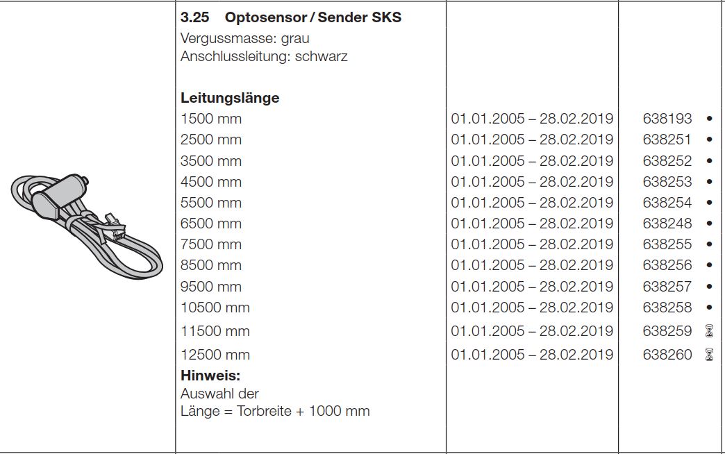 Hörmann Optosensor / Sender SKS Vergussmasse grau Anschlussleitung / schwarz Leitungslänge von 1500 mm bis 12500 mm