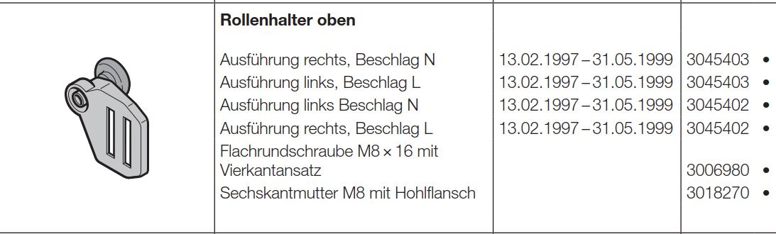 Hörmann Rollenhalter oben mit Laufrolle links für Baureihe 30, 40 (Privat-Tore), 3045402