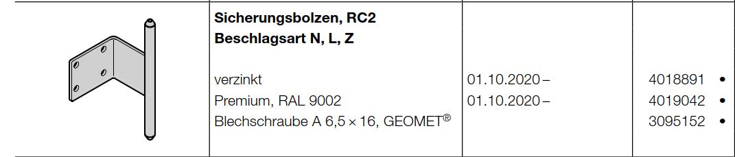 Hörmann Sicherungsbolzen RC2, Beschlagsart N, L, Z für Baureihe 40 (Privat Tore)