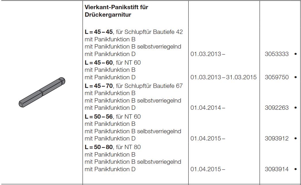Hörmann Vierkant-Panikstift für Drückergarnitur L=45–70 für Schlupftür Bautiefe 67 Baureihe 30-40-50-60