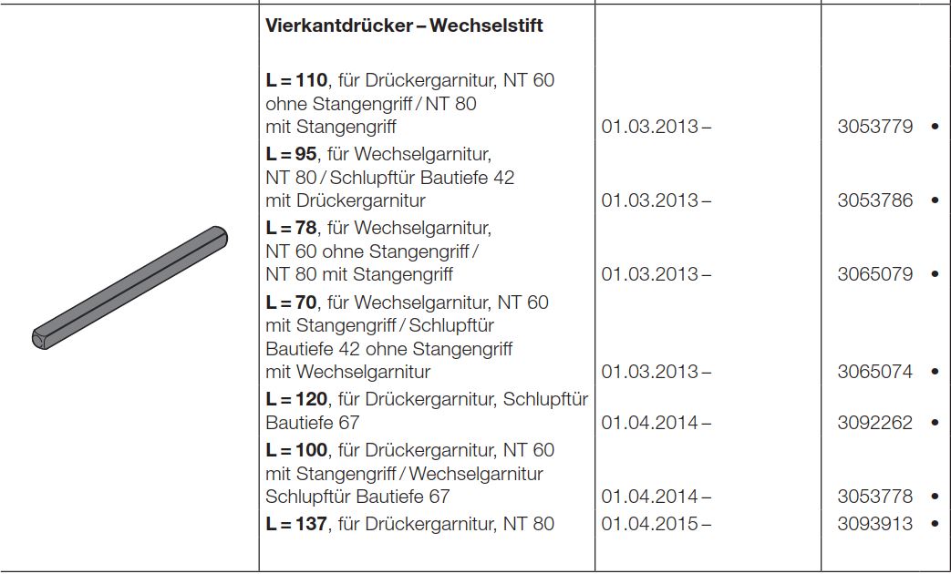 Hörmann Vierkant-Wechselstift L=78 für Wechselgarnitur NT 60, Baureihe 40-50-60