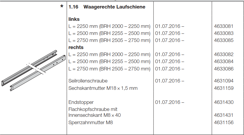 Hörmann waagerechte Laufschiene links L = 2250 mm