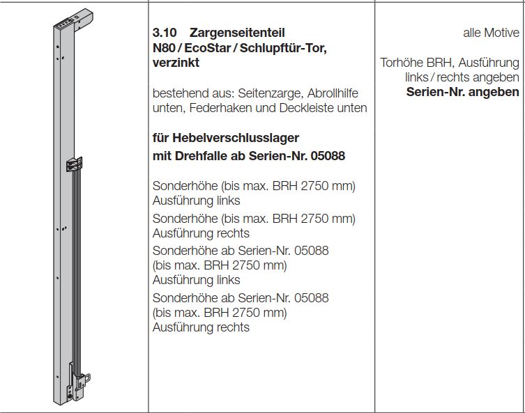 Hörmann Zargenseitenteil N80, EcoStar, Schlupftür-Tor verzinkt, Sonderhöhe, links