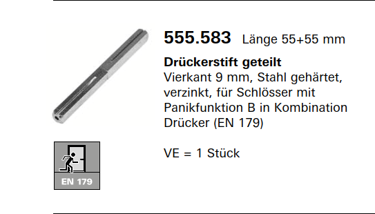 Jansen-Economy 60 RC Türen Drückerstift Vierkant 9 mm, Stahl gehärtet, Länge 55+55 mm, Artikelnummer 555.583