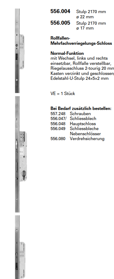 Jansen-Economy 60 RC Türen Mehrfachverriegelungs-Schloss Normal-Funktion, Stulp 2170 mm ø 22 mm, Artikelnummer 556.004