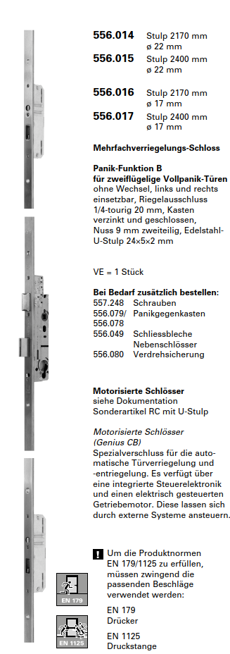 Jansen-Economy 60 RC Türen Mehrfachverriegelungs-Schloss, Panik-Funktion B, zweiflügelig Vollpanik-Türen, Stulp 2170 mm ø 17 mm, Artikelnummer 556.016