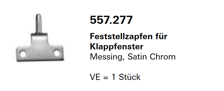 Jansen Janisol Arte 2.0 Feststellzapfen für Klappfenster, Messing, Satin Chrom, Artikel Nr.557.277