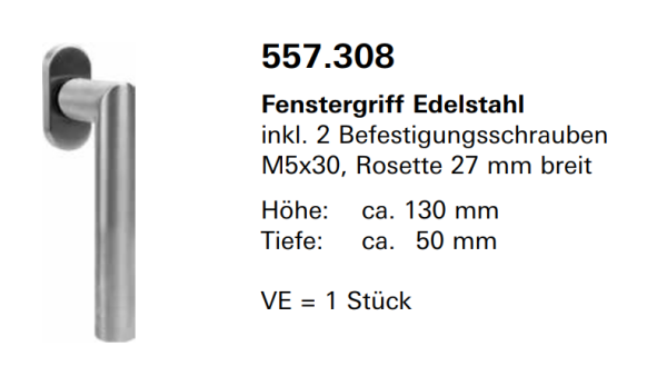 Jansen, Janisol Arte 66, Fenstergriff Edelstahl inkl. 2 Befestigungsschrauben M5x30, Rosette 27 mm breit, 557.308