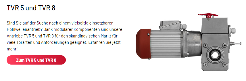 Dank modularer Komponenten sind unsere Antriebe TVR 5 und TVR 8 für den skandinavischen Markt für viele Torarten und Anforderungen geeignet.