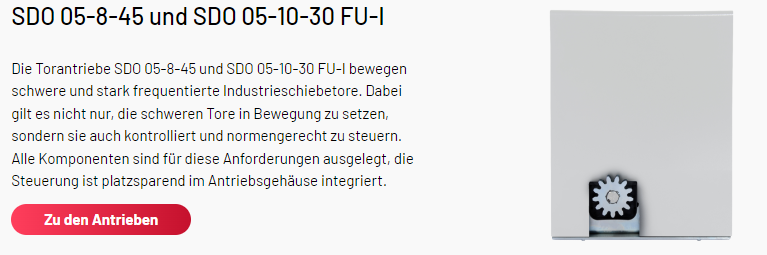 Die Torantriebe SDO 05-8-45 und SDO 05-10-30 FU-I bewegen schwere und stark frequentierte