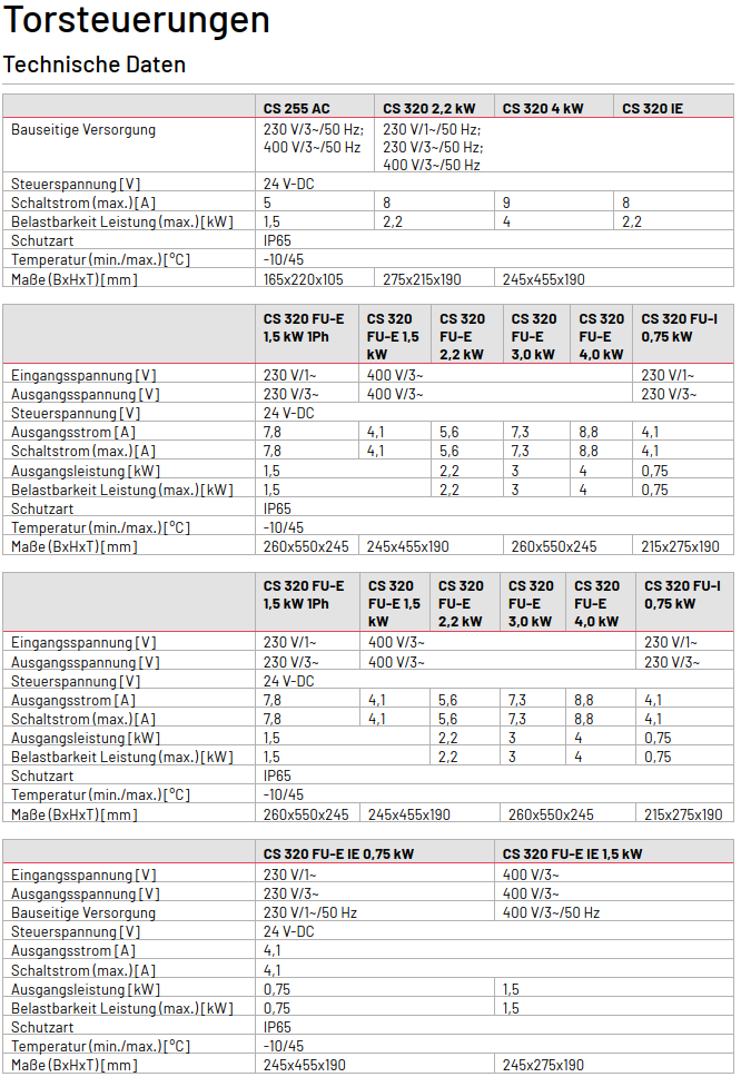 Marantec, Steuerungen CS320 FU-E, Anschlussspannung 1x 230VAC und Motore bis 1,5kw