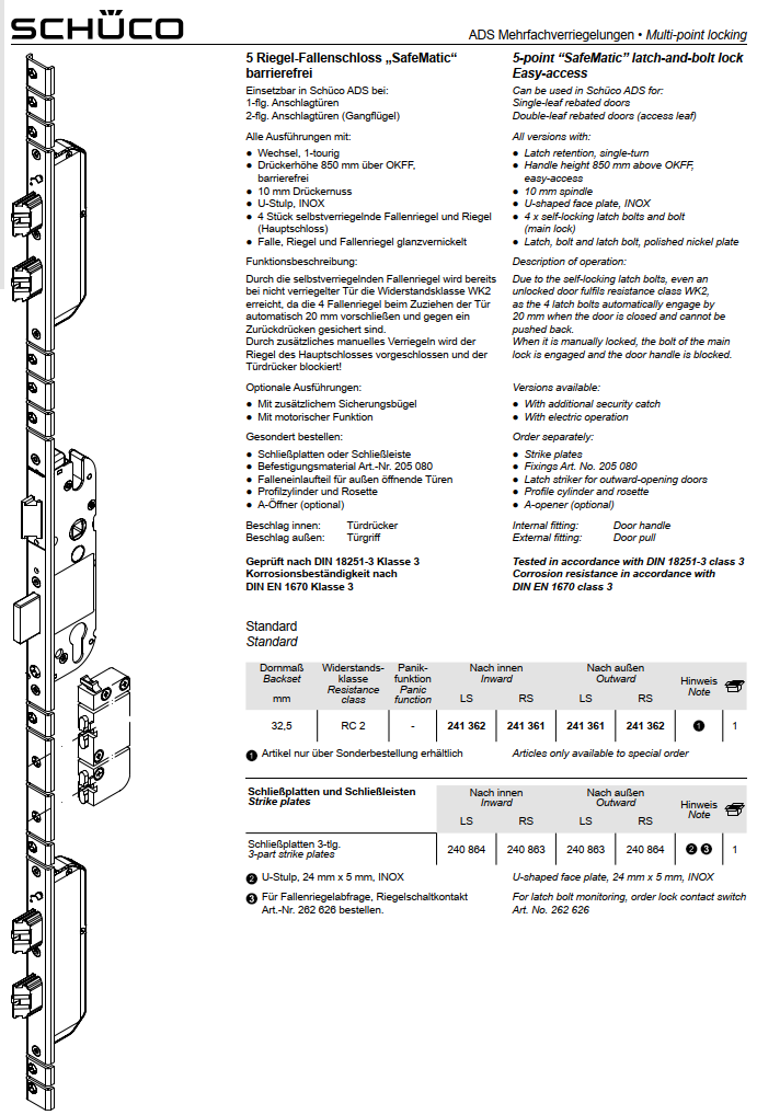 Schüco ADS Mehrfachverriegelungen, 5 Riegel-Fallenschloss „SafeMatic“ barrierefrei, RC2, Dornmaß 32,5 mm, 241362, LS nach innen