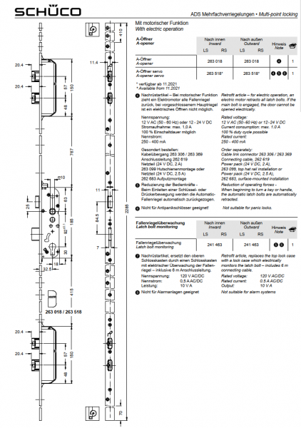 Schüco ADS Mehrfachverriegelungen, 5 Riegel-Fallenschloss „SafeMatic“ barrierefrei, RC2, Dornmaß 32,5 mm, 241362, RS nach außen