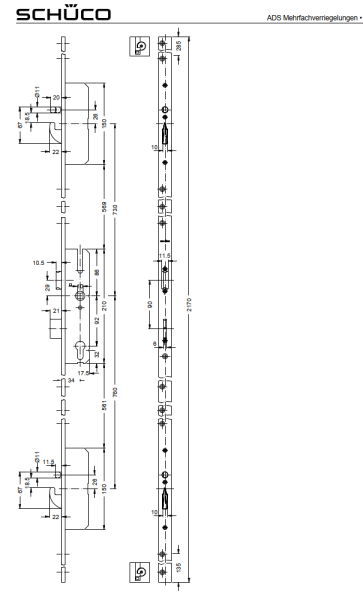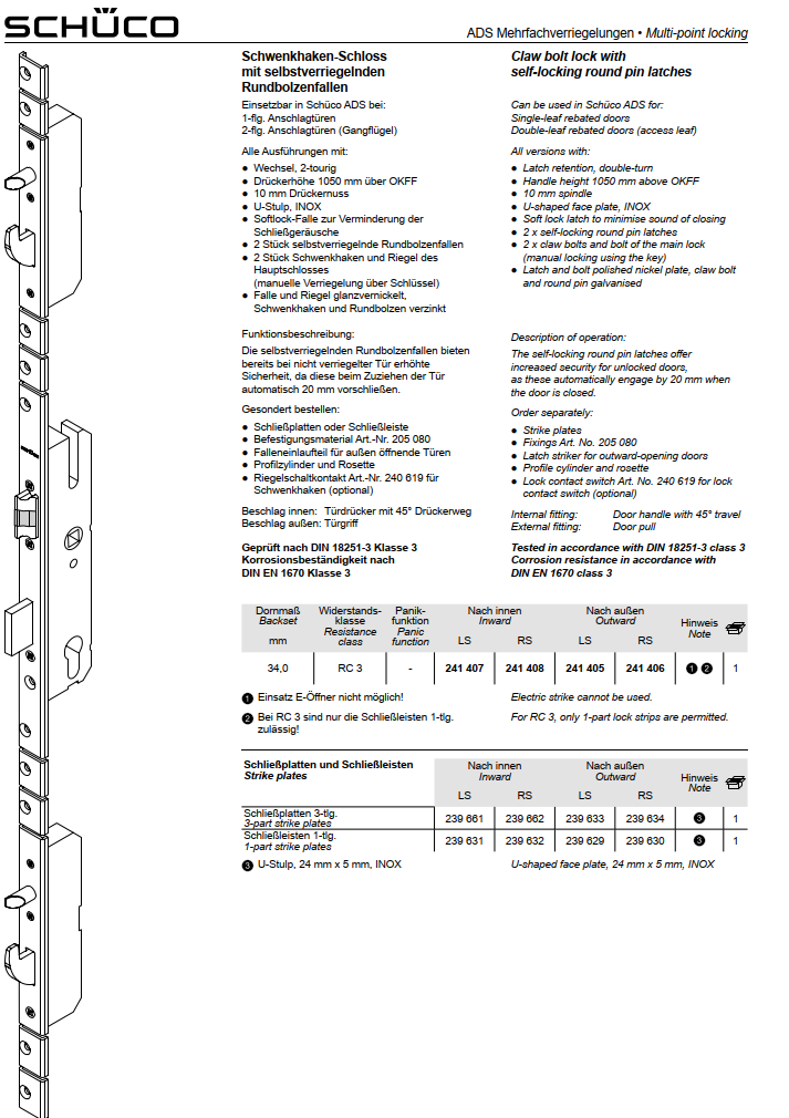 Schüco ADS Mehrfachverriegelungen, Schwenkhaken-Schloss mit selbstverriegelnden Rundbolzenfallen, RC3, Dornmaß 34,0 mm, 241408, RS