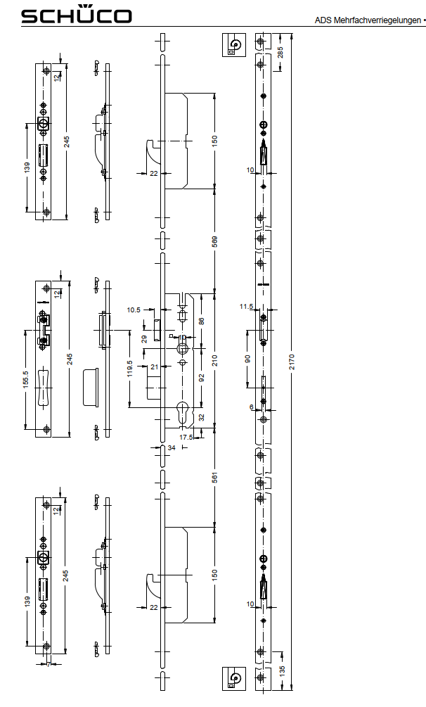 Schüco ADS Mehrfachverriegelungen, Schwenkhaken-Schloss, RC2, Dornmaß 34,0 mm, 241439, LS, nach außen