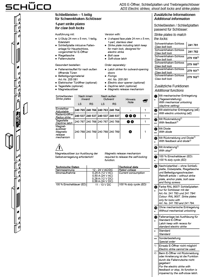 Schüco ADS Schließleiste–1-teilig für Schwenkhaken-Schlösser, 240764, RS nach außen