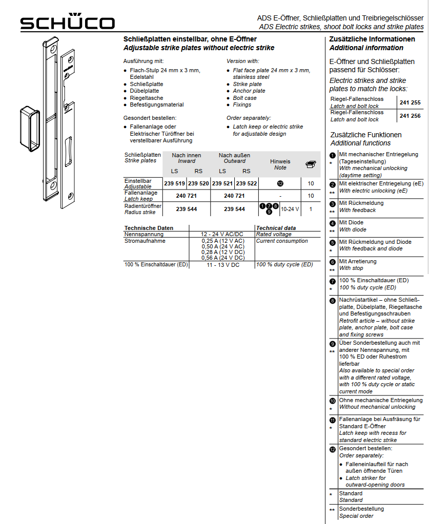 Schüco ADS Schließplatten einstellbar, ohne E-Öffner, 239519, LS nach innen