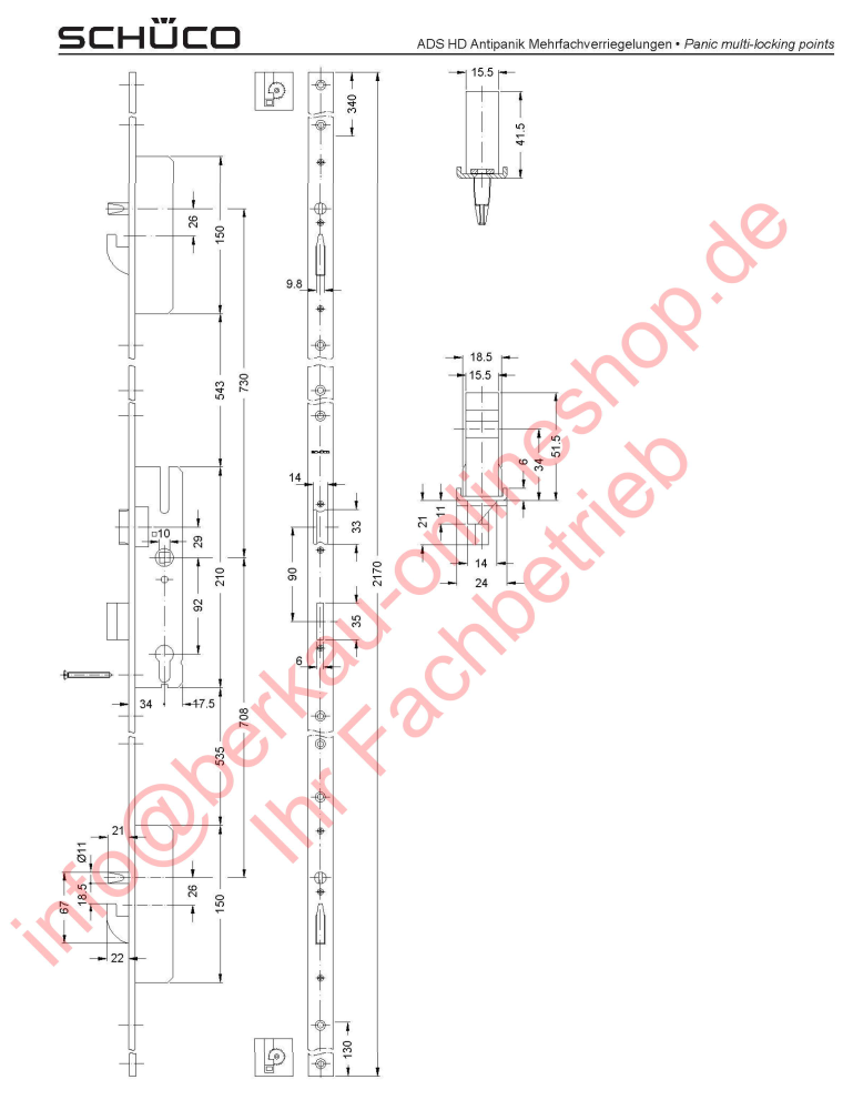 Schüco Antipanik E, Schwenkriegel-Bolzenschloss, Mehrfachverriegelung, 211641, Dornmaß 34,0 mm