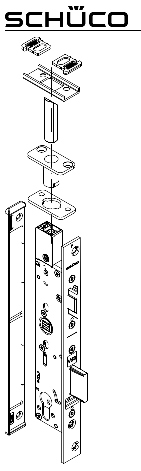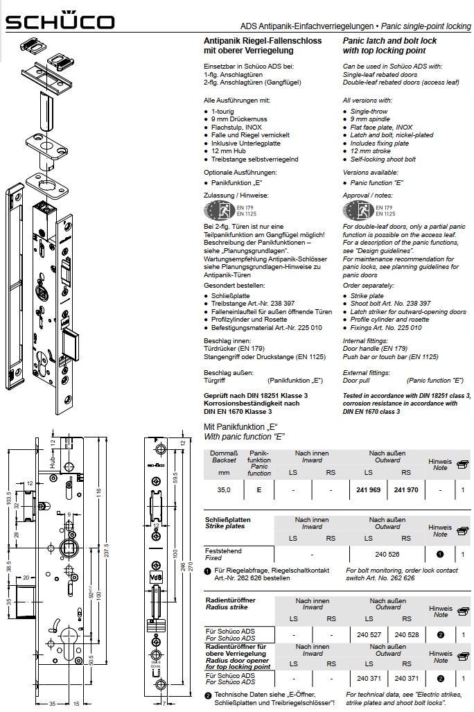 Schüco Antipanik Riegel-Fallenschloss mit oberer Verriegelung, 241 969, ADS, nach außen LS, mit Panikfunktion E