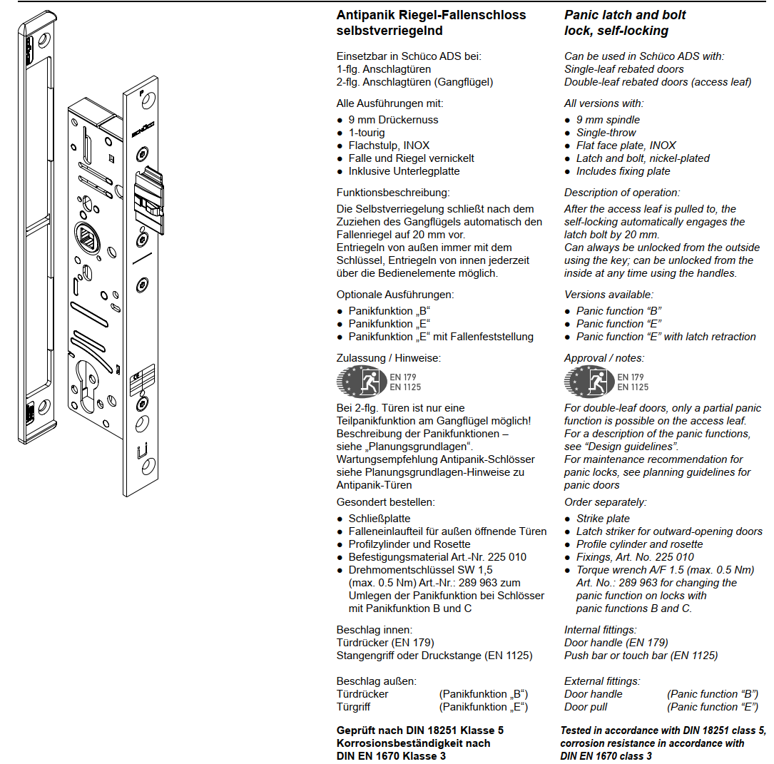 Schüco Antipanik Riegel-Fallenschloss selbstverriegelnd, 241 833, ADS, nach innen RS, mit Panikfunktion B
