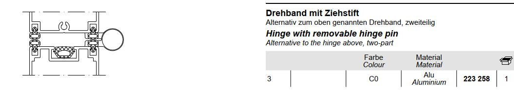 Schüco Drehband mit Ziehstift, ASS 50 FD.NI, CO Artikelnummer, 223258, 223 258, Aluminium
