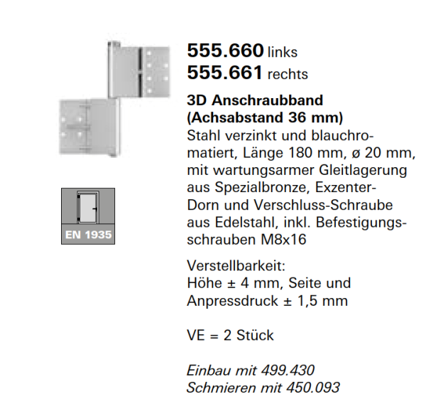 Schüco Jansen 3D-Anschraubband (Achsabstand 36 mm) Stahl verzink, Länge 180 mm, ø 20 mm, Artikelnummer 555.661, DIN rechts