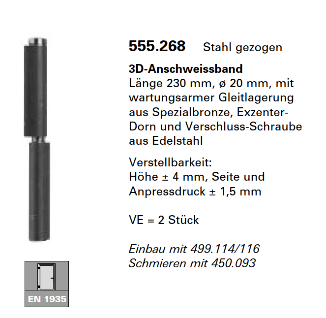 Schüco Jansen 3D-Anschweissband Länge 230 mm, ø 20 mm, mit wartungsarmer Gleitlagerung, Artikelnummer 555.268, Janisol HI, Janisol 2 EI30 Türen