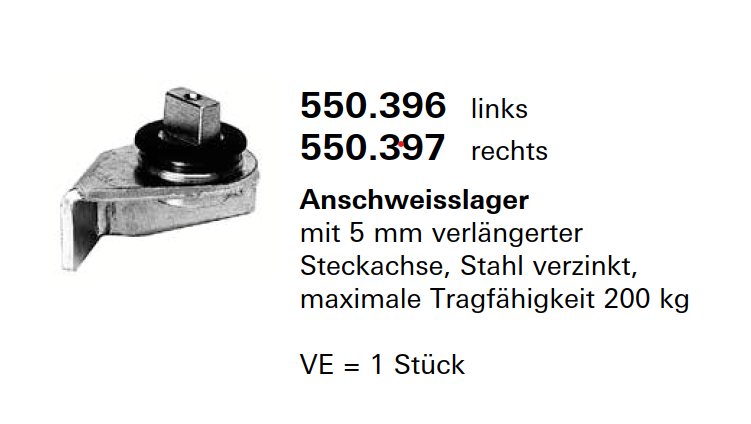 Schüco Jansen Anschweisslager mit 5 mm verlängerter Steckachse, Stahl verzinkt, Artikelnummer 550.397 rechts