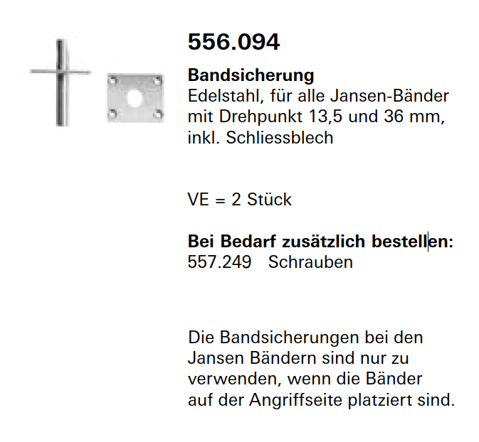 Schüco Jansen, Bandsicherung Edelstahl, für alle Jansen-Bänder mit Drehpunkt 13,5 mm und 36 mm, Artikelnummer 556.094