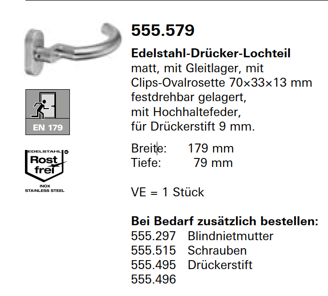 Schüco Jansen Edelstahl-Drücker-Lochteil matt, mit Gleitlager, Artikelnummer 555.579, Janisol HI Türen