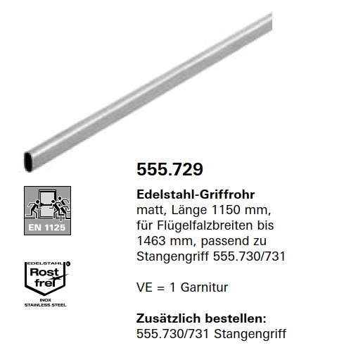 Schüco Jansen Edelstahl-Griffrohr matt, Länge 1150 mm, Artikelnummer 555.729