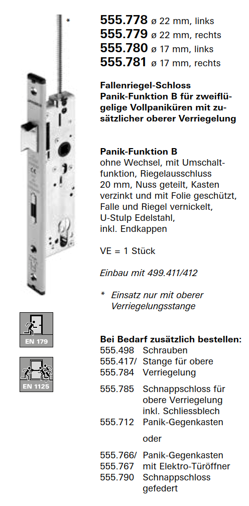 Schüco Jansen Fallenriegel-Schloss Panik-Funktion E, Artikelnummer 555.782 ø 22 mm links/rechts, Janisol HI Türen