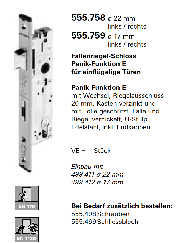 Schüco Jansen Fallenriegel-Schloss, Panik-Funktion E, Jansen Artikelnummer 555.758 ø 22 mm links-rechts, Zubehör Janisol HI Türen