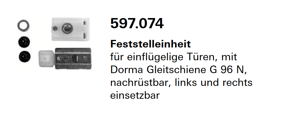 Schüco Jansen Feststelleinheit für einflügelige Türen, mit Dorma Gleitschiene G 96 N, Artikelnummer 597.074, Janisol HI Türen