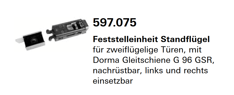 Schüco Jansen Feststelleinheit Standflügel für zweiflügelige Türen, mit Dorma Gleitschiene G 96 GSR, Artikelnummer 597.075, Janisol HI Türen